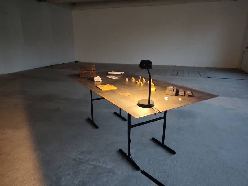 2021, a eu lieu à Salmaise une première exposition dite ' Fragments d'Esquilles'. Y furent présentés plusieurs petites valises et contenants, des documents d'artistes amis aux démarches similaires, des mémoires de rencontres. Temps discret marqué du sceau de l'intime.