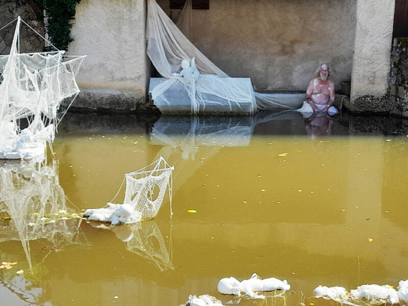- Yves Henri, en compagnie de Stéphane Guillaumon (danseuse), Jean Préteux (création sonore) et Rémy Matrat (sax), se livre à une performance au bord du Sornin qui coule près de la Filature et sur lequel flotte son installation Des Rêves engloutis. Après avoir travaillé dès le début des années 80 des oeuvres souvent très engagées sculptées avec le bois, la pierre ou le métal, c’est depuis plus d’une décennie son propre corps qui devient son principal matériau. A présent installateur et performeur. Yves Henri vit aujourd’hui dans son atelier de Grigny mais c’est sur la Saône, vers la péniche qu’alors il habitait, que son « vaisseau fantôme » est né. Avec son complice, le philosophe Alain Kerlan, il est l’auteur de plusieurs ouvrages dont Le Petit Peuple des Guetteurs ou bien encore Chronique du vaisseau fantôme de Leros. « J’investis des lieux pour leur histoire, leur ambiance, pour ce qu’ils me suggèrent, écrit-il, le temps d’une installation éphémère, perturbatrice d’habitudes et de conventions acquises .»
