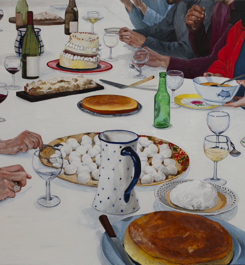 La scène d’un repas porte en elle plein de possibilités d’associations conceptuelles, évoquant autant l’histoire de la peinture, la mythologie et le symbolisme religieux que l’expérience personnelle, les souvenirs qui s’en dégagent.